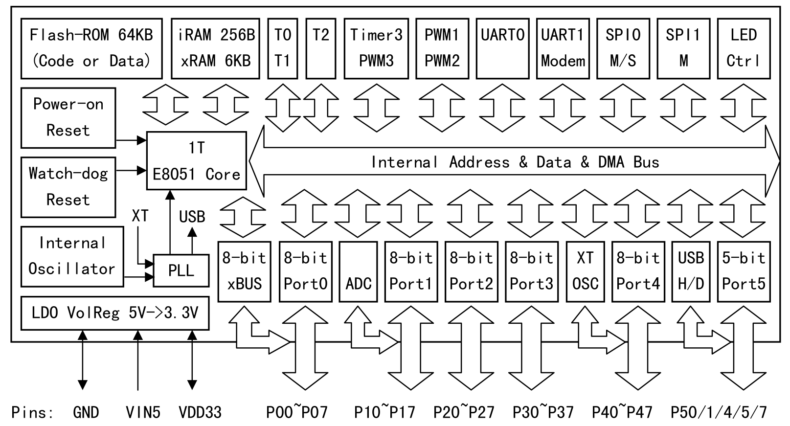 左上からフラッシュが64Kで、メモリが256Bと6KBの2種類。タイマーがT0からT3の4種類。PWMがPWM1からPWM3までの3種類。UARTがUART0とUART1の2種類。SPIがSPI0とSPI1の2種類。LEDコントロールがありますがPWMではないのでなんだろう。起動時のパワーオンリセットと、ウォッチドッグリセットがあって、内部発振器もしくは外部発振器からPLLでクロックをn倍に逓倍(ていばい)する構成のようです。またLDOが内蔵されており、5V入力から3.3Vが作れるんですね。あとはポートがたくさんならんでいます。