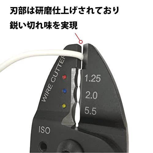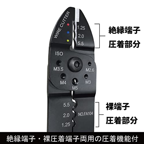 ちなみに色がついているのが絶縁端子になります。圧着する場所が裸圧着端子と絶縁端子で違うので注意して使いましょう。ちなみに電工ペンチは一般的に1.25sqから使うことが多いので、0.75sqには対応していない場合があります。