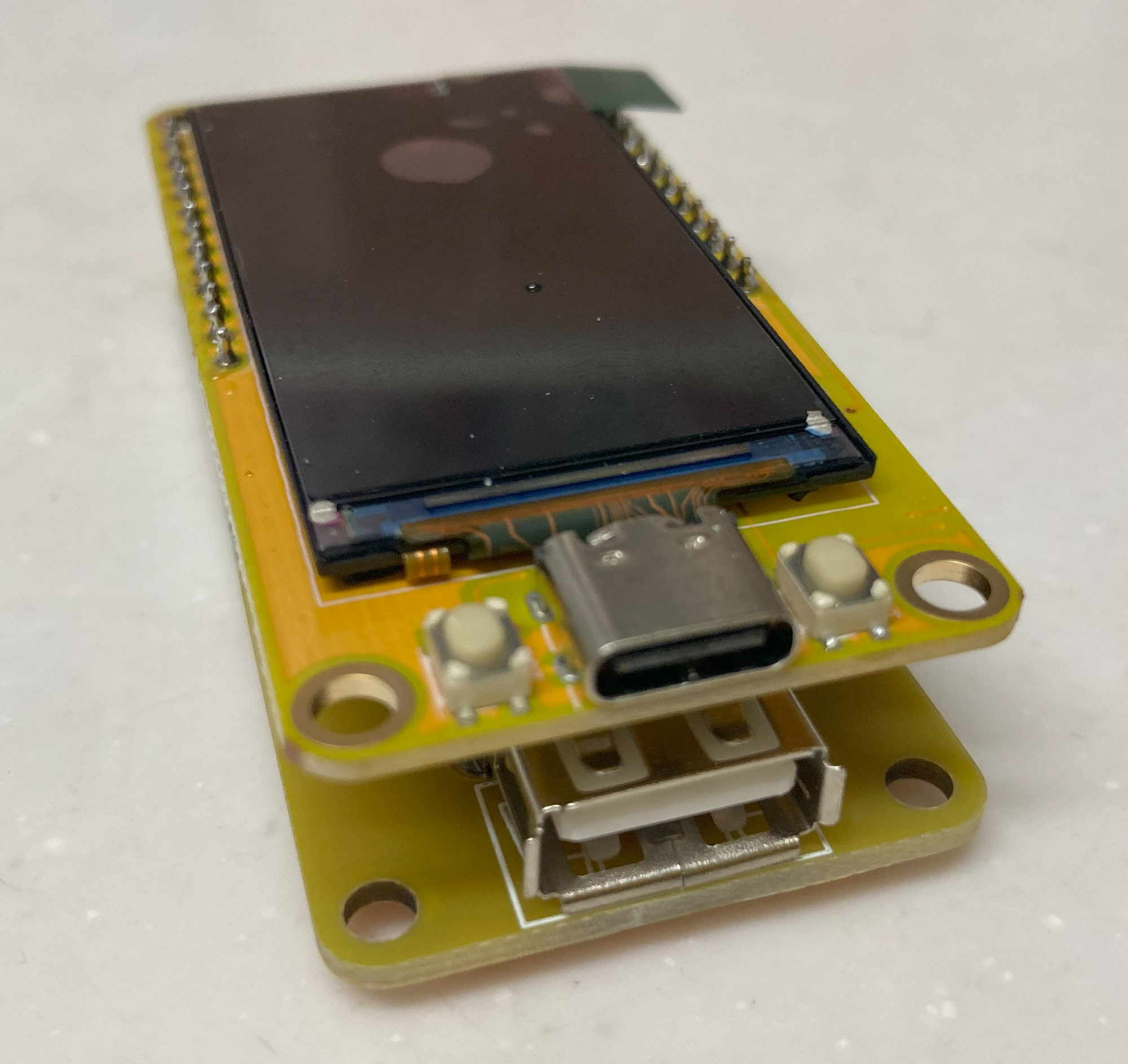 組み立ててみました。ちゃんとハマっています。USBホストのみの場合には手前の出っ張っているオスコネクタは実装する必要がありません。