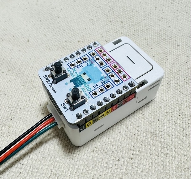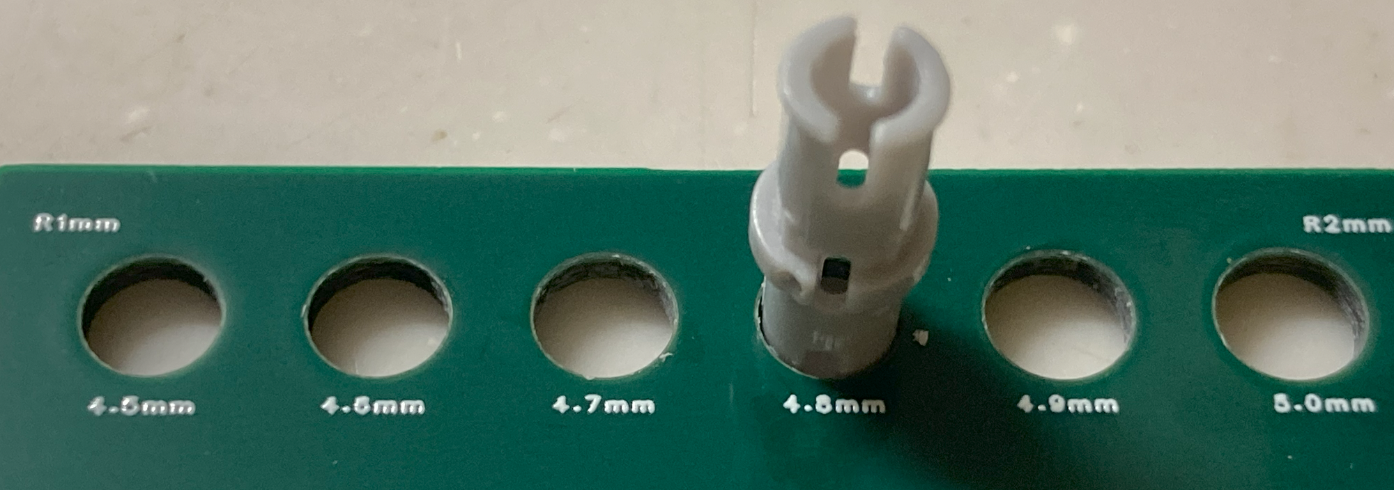 上に謎の穴が並んでいましたが、これはレゴのピンを使うのに適した大きさを探すためでした。4.8mmだとストッパー付きのものである程度固定できそうですが、基板の穴はエッジが尖っているのでピンの先っぽを入れるときに削れます。ゆるい固定で問題ない場合には4.9mmか5.0mmぐらいが無難だと思います。