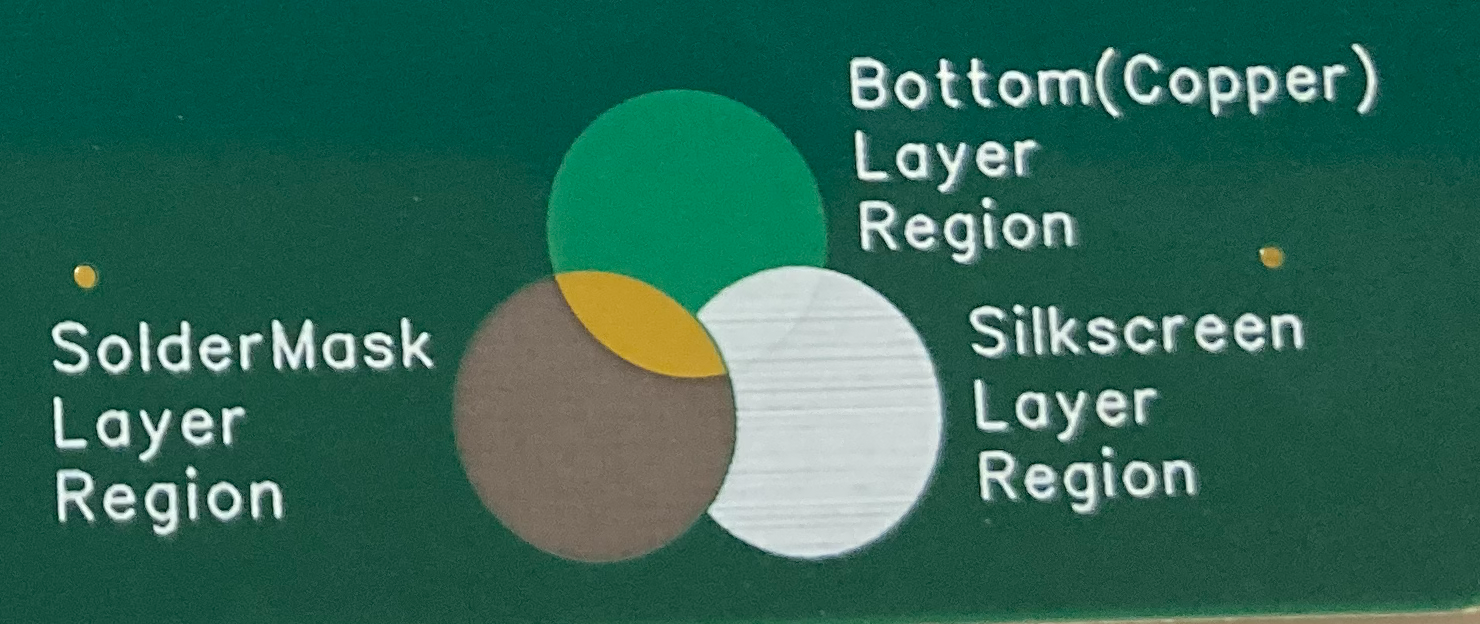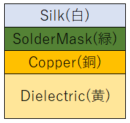 いろいろな種類がありますが、基板は上記の4種類が外から見えます。一番下が基板自体の構造物であるDielectricで、2層基板は通常黄色っぽい色になります。その上に銅の層があり、パッド以外の場所にハンダが乗らないようにソルダーマスクでカバーしていて、その上にシルクスクリーンで文字などが書いてあります。