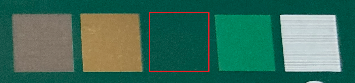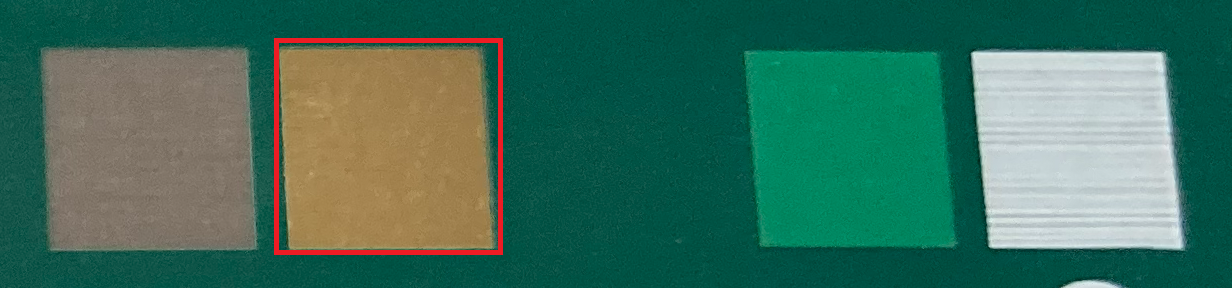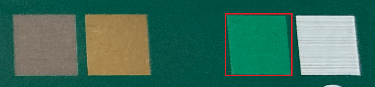右から2番目はシルクがなくて、ソルダーマスクとカッパーがあるパターンです。緑の場合には下の銅の色が透けて薄い緑になります。