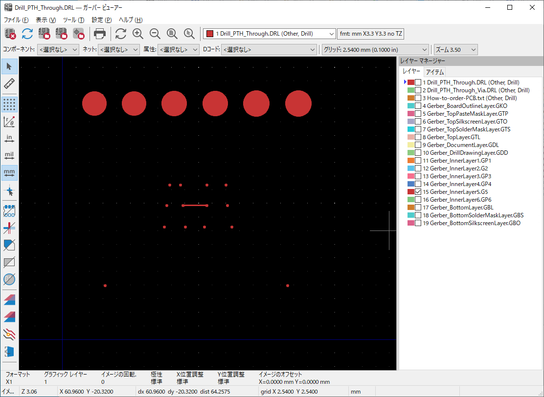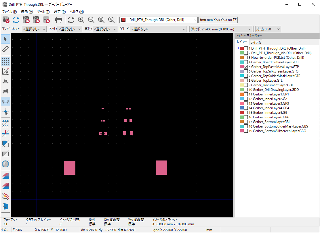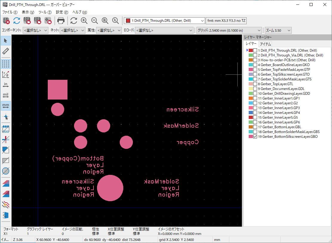 EasyEDAでガーバー出力をしたものをKiCADのガーバービュアーで確認したところ19レイヤーがありました。一番上から確認していきます。