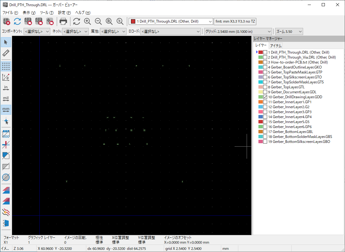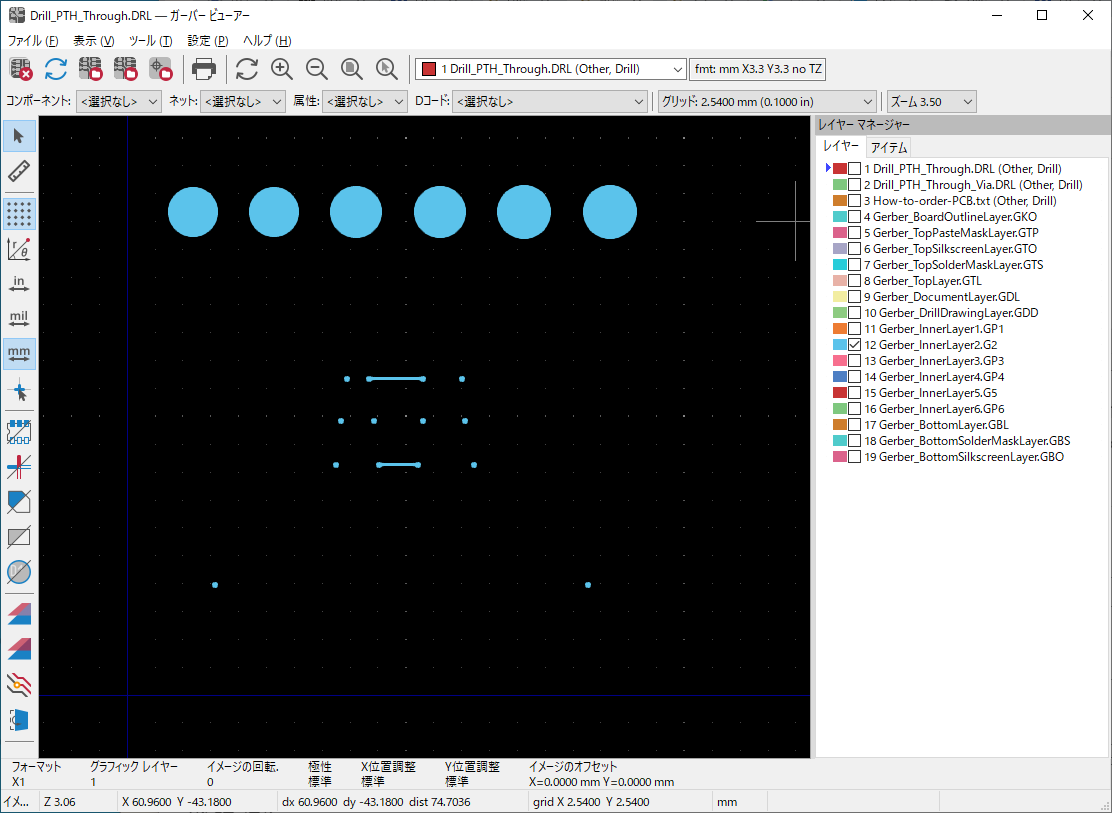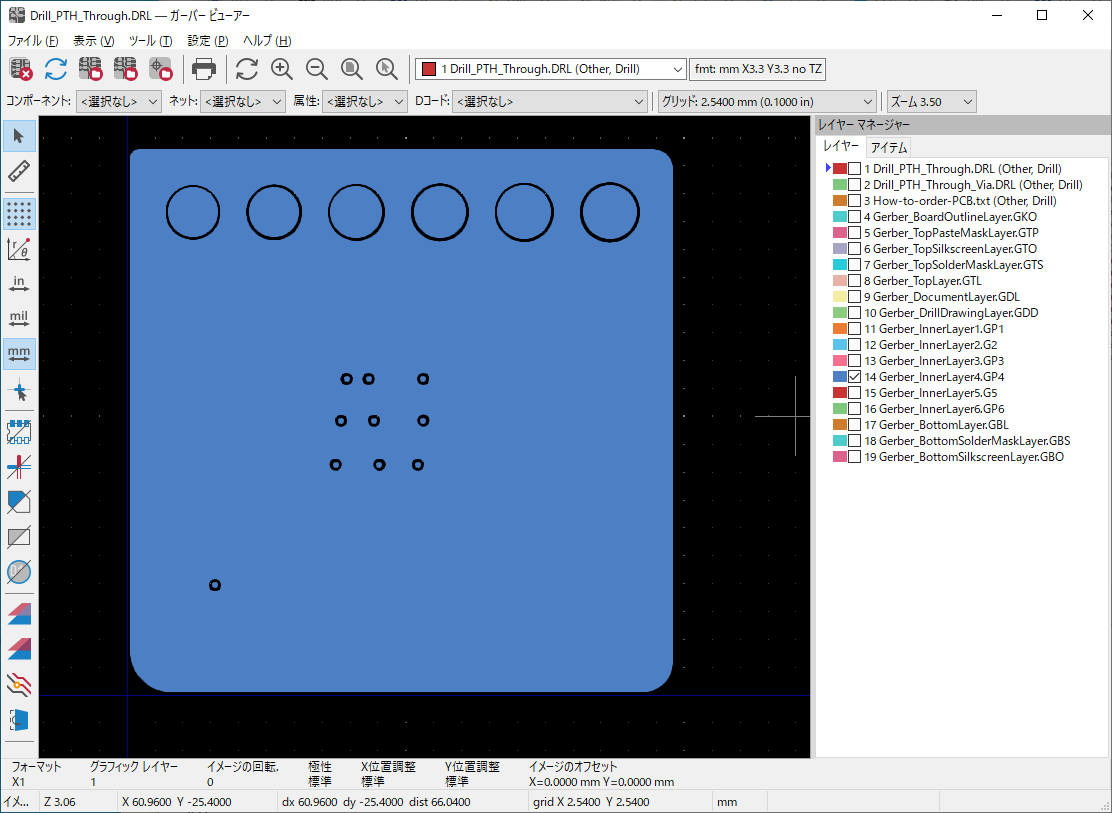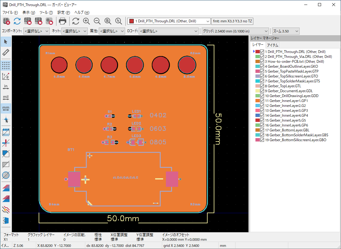 EasyEDAでガーバー出力をしたものをKiCADのガーバービュアーで確認したところ19レイヤーがありました。一番上から確認していきます。