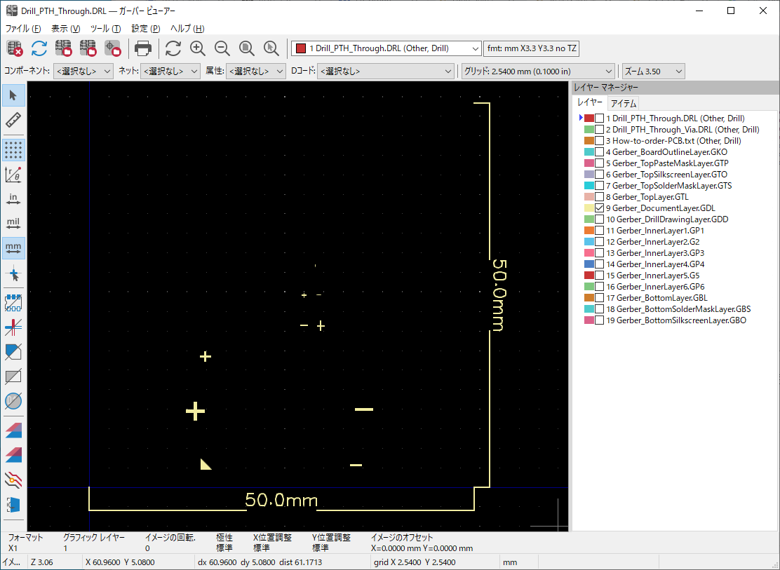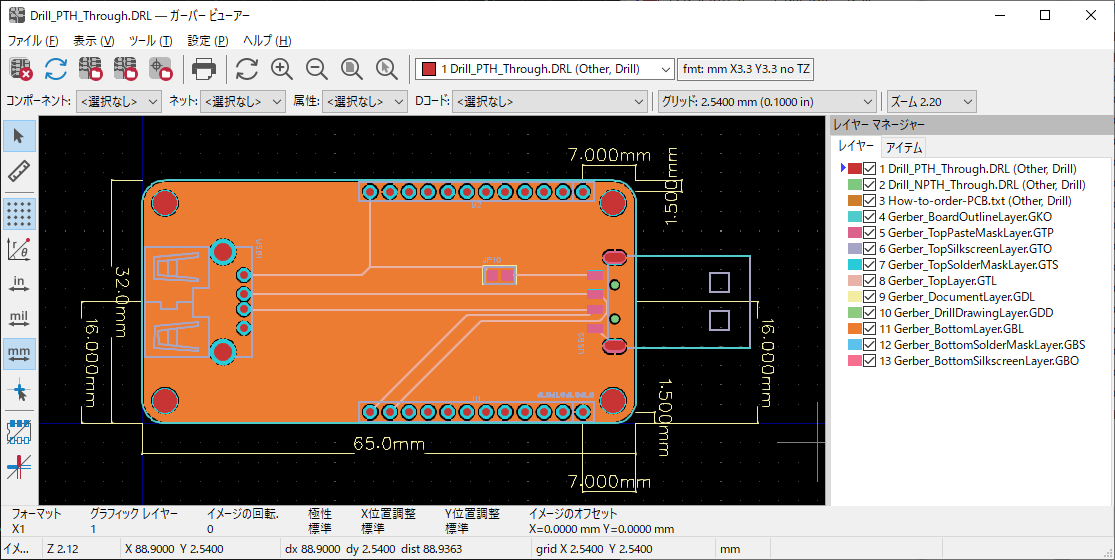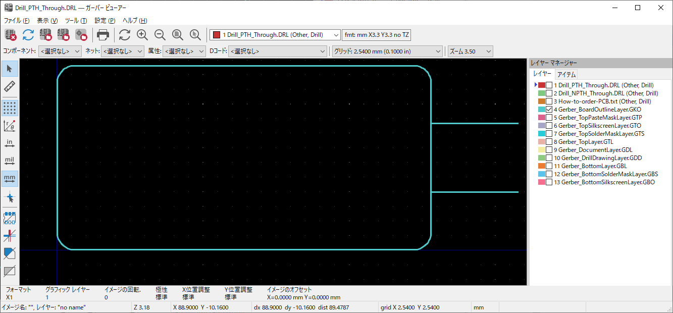 黄色基板などでは上記のようにUSBコネクタの部分に何故か外形があり、ガーバービュアーなどで正しく表示できないPCB製造メーカーがありました。
