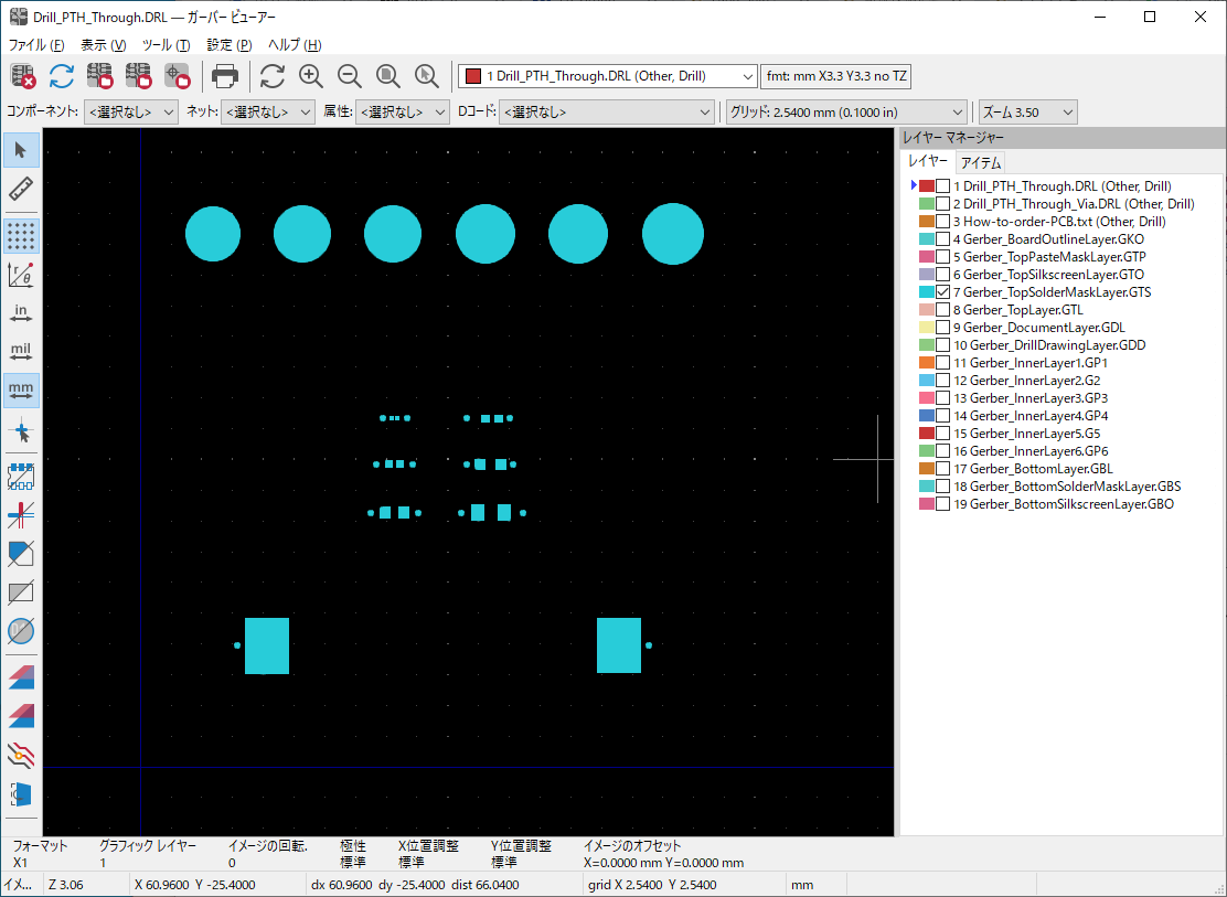 ボトムなので裏側の銅パターンレイヤになります。小さい丸はビアで、一番上に並んでいる丸は穴、四角と下の丸がデザイン確認用のパターンになります。