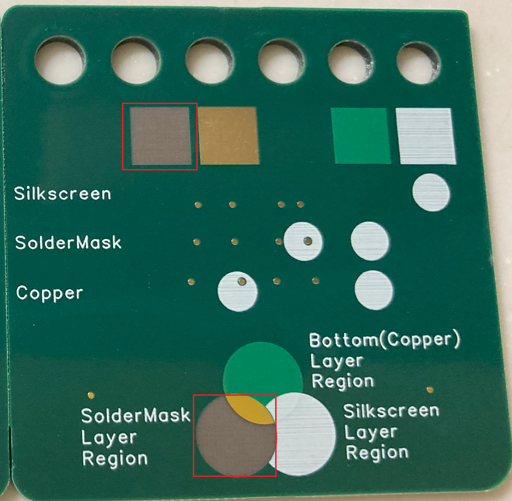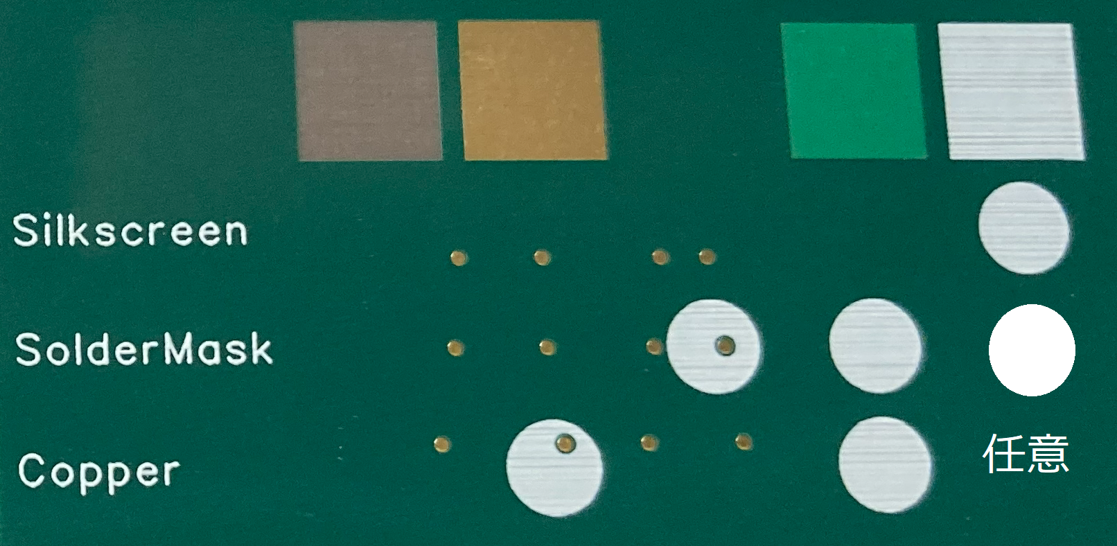これは予想と違ったのですが、3種類のレイヤーを丸で重ねたものを製造したところ、シルクスクリーンが一番強いと思ったのですが、ソルダーマスクの方が強かったです。