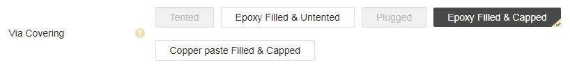 8層基板の場合にはビアには注意してください。上記がデフォルト設定でエポキシ樹脂で埋めて、キャップをつけます。下の銅で埋めるのは非常に高いので通常選びません。もう一つがエポキシ樹脂で埋めてテント無しです。