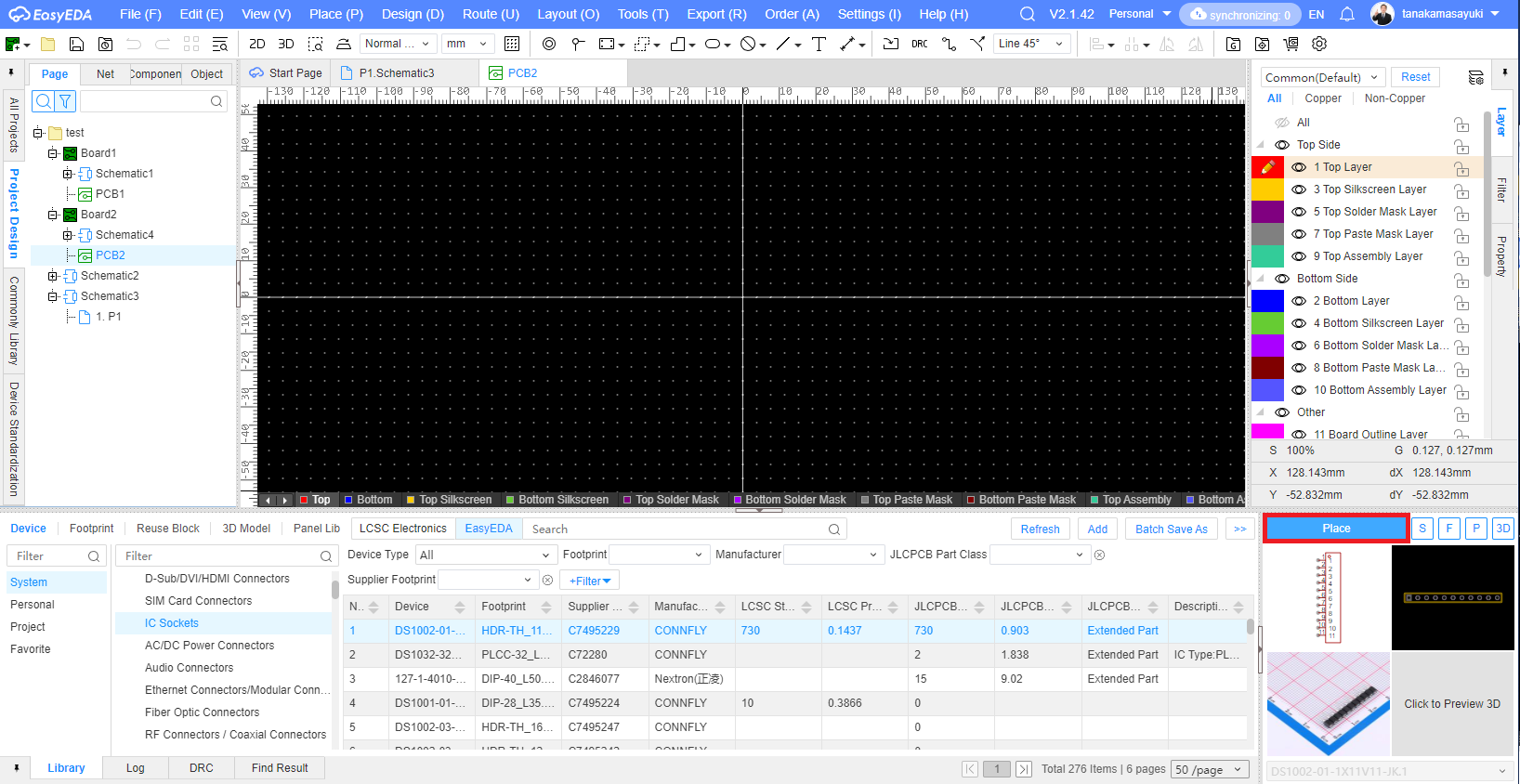 長らく操作方法が分からなかった、回路図をかかないでの部品配置ですがメニューからではなく、画面下にあるライブラリから部品を選択して、右側にあるPlaceボタンで配置できました。ただしネット情報が登録されていないので単純な部品以外はおすすめしません。