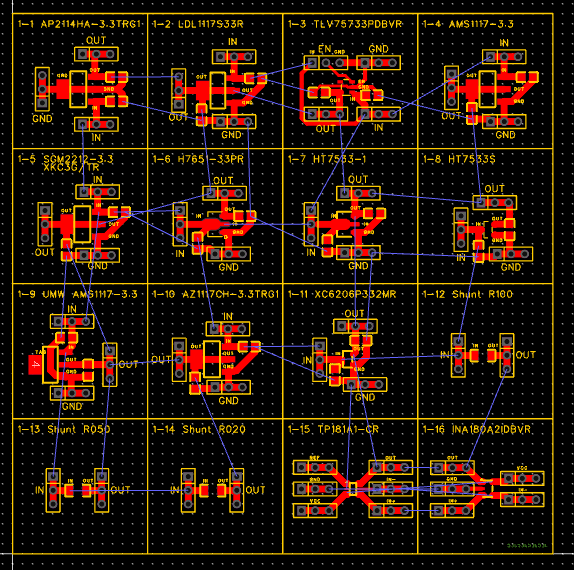 こんな感じで25mm x 25mmの基板を普通にデザインします。単体でDRCできるので最低限のチェックはされています。とはいえ16種類あるので何個かはミスっていそうです。。。