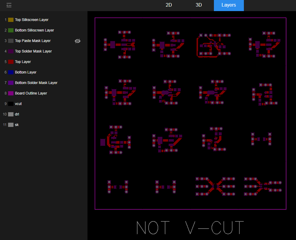 こんな基板を作ってみました。100mm x 100mmと3ドルで作れる基板で最大サイズに25mm四方のサブ基板を16個並べています。こちらV-CUTをすると追加料金がかかりますが、シルク印刷だけなので3ドルで注文できるはずです。