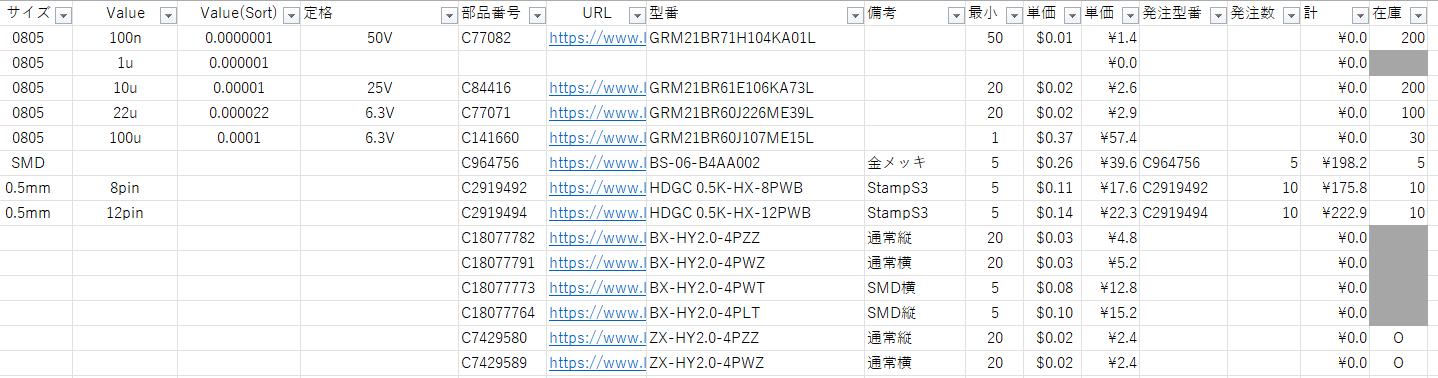 いろいろ項目がありますが、必要なのはLCSCのパーツ番号と個数だけです。エクセルで個数が入っている場合だけパーツ番号がでるIF文を入れてあります。これで一気にカートに追加できました。
