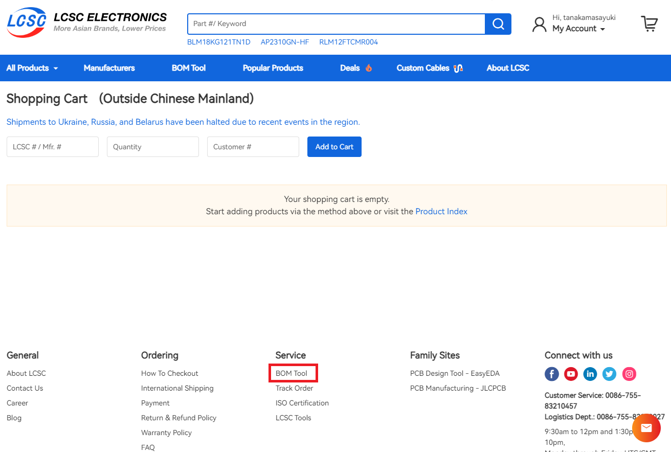 フッターにあるBOM Toolを利用します。他社はカートの目立つ場所にあるのですがLCSCさんはちょっとわかりにくい場所にあります。