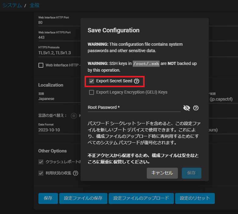 実際のデータは別ドライブのZFSなのでブートドライブはあまり重要ではないようです。調子が悪いお思ったら即設定ファイルを保存しましょう。できればバージョンアップなどの際に定期的に保存しておくと安心です。