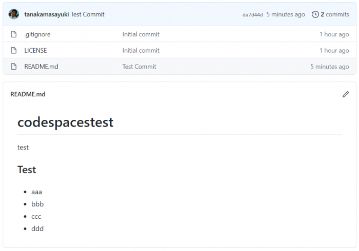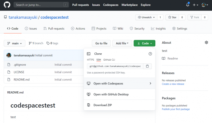 テスト用に新しいリポジトリを作成してみました。Codeの中に「Open with Codespaces」が増えていますので、こちらを選択します。