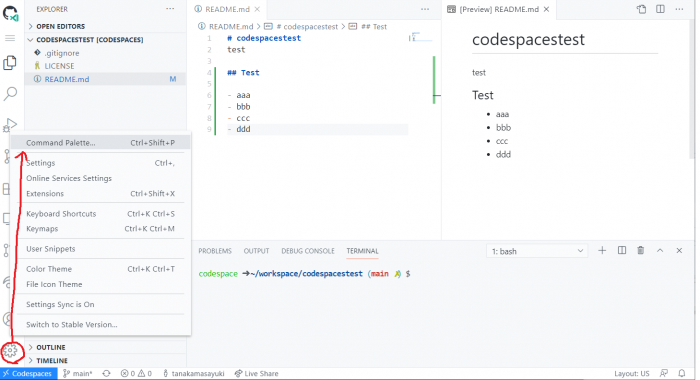 README.mdを編集してみました。左下の設定ボタンから「Command Palette…」を選択してコマンドパレットを開きます。Windows環境だとCtrl+Shift+Pなのですが、ブラウザの印刷が開いちゃいます。。。