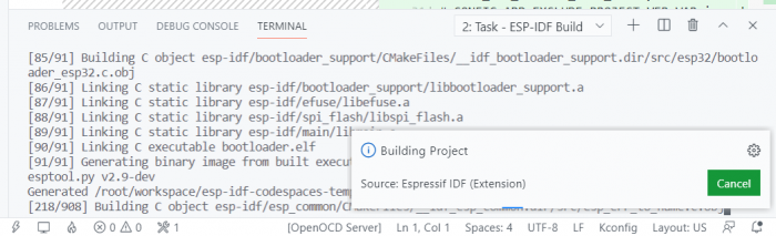 ターミナルのタスクをみるとビルドが進んでいるのがわかると思います。しかし結構重いです、、、ESP-IDFは初回コンパイルは重いので仕方ないですね。