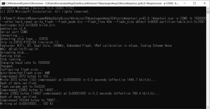 C:\Users\%username%\AppData\Local\Arduino15\packages\esp32\tools\esptool_py\2.6.1\esptool.exe -p COM3 -b 1500000 --after hard_reset write_flash --flash_mode dio --flash_freq 40m --flash_size detect 0x8000 partition-table.bin 0x1000 bootloader.bin 0x10000 blink.bin