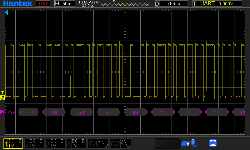 最近のオシロスコープなのでUARTとかもデコードできます。ただし、32Kptでないとデコードしてくれないので、ちょっと長めのデータを取得していると使えません。ONにしようとするとエラーになるのですが、メニューから変更してから再度デコード設定をONにする必要があります。強制的に32Kに変更してくれてもいいのに。。。