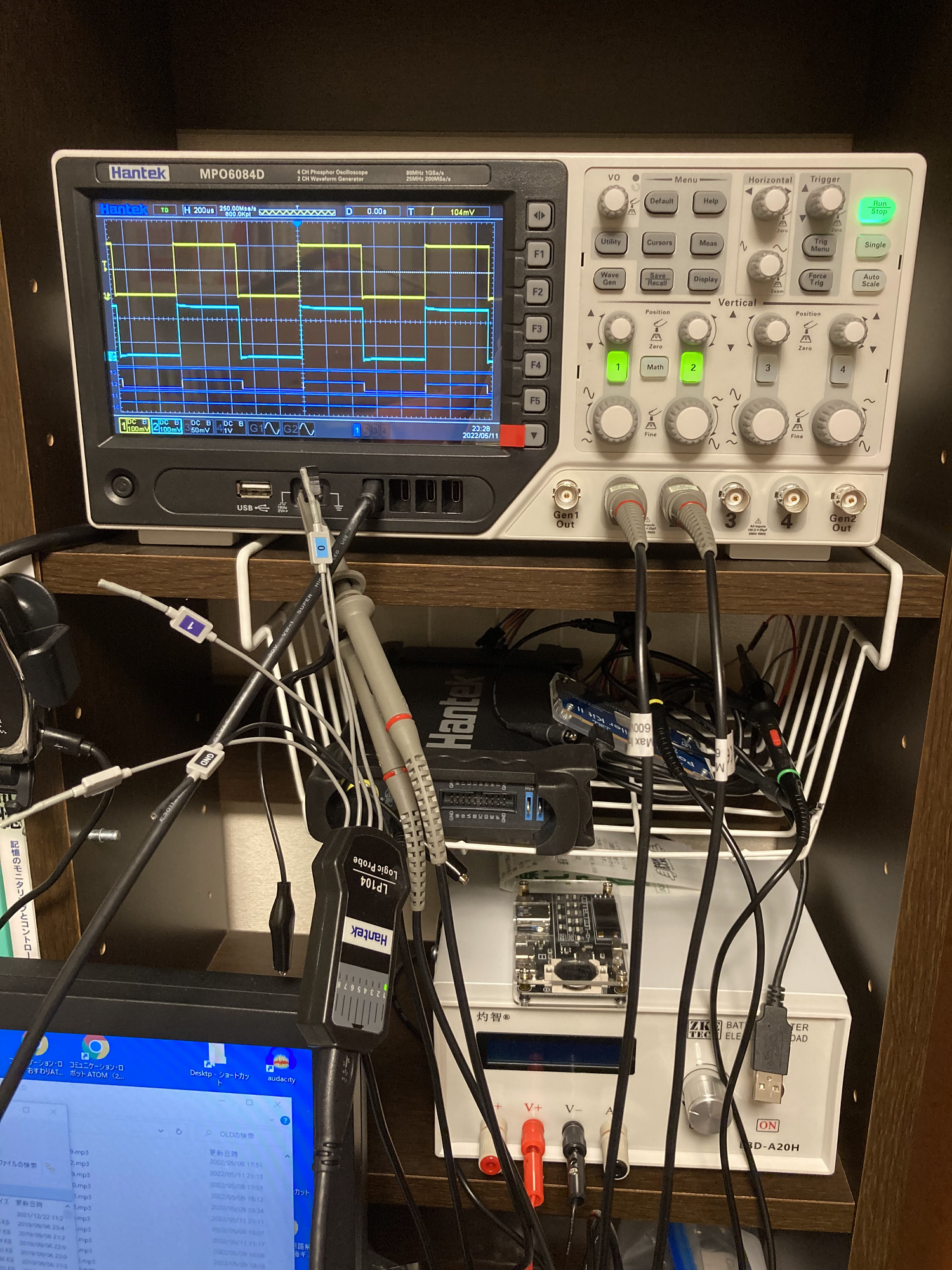 机に設置しました。やっぱり机にオシロスコープがあるのは便利です。USBタイプはアプリを立ち上げる手間があるのですが、スイッチぽちで起動するほうがちょっとしたときに使いやすいですね。