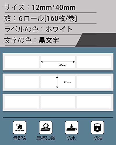 Phomemo D30ラベルプリンター専用 純正 白地 テープ ラベルシール 黒文字 感熱ロール紙 シール 印刷用紙 接着剤ある 再剥離タイプ シール 白地 黒文字 160枚入り/巻 6巻セット 12mm*40mm 宛名/DIYラベル/値札/整理収納/分類整理