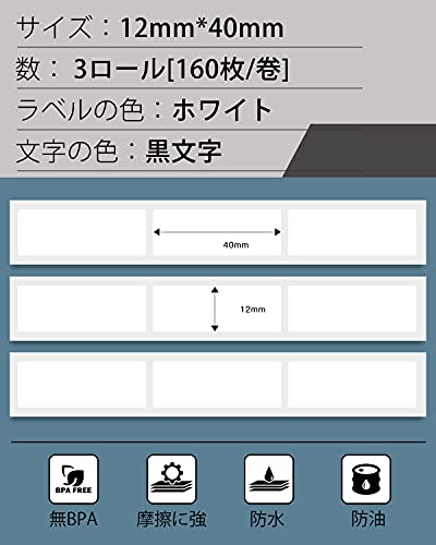 Phomemo D30ラベルプリンター専用 純正 白地 テープ ラベルシール 黒文字 感熱ロール紙 シール 印刷用紙 接着剤ある 再剥離タイプ シール 白地 黒文字 160枚入り/巻 3巻セット 12mm*40mm 宛名/DIYラベル/値札/整理収納/分類整理も可能