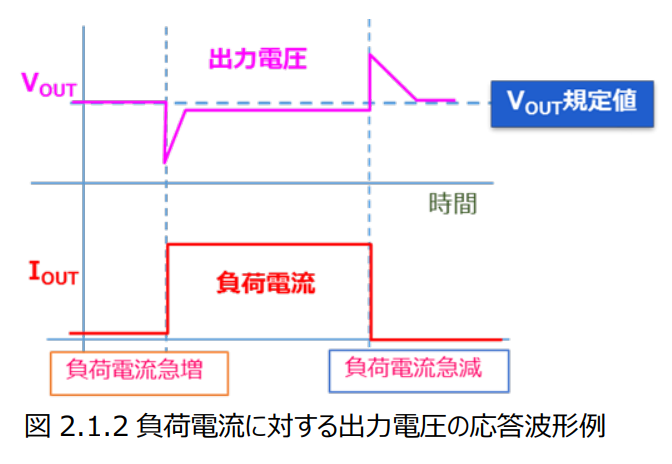 実はこれは非常に重要な概念みたいです。上記のように負荷電流が急激に上がると出力電圧が下がり、負荷電流が急減すると出力電圧があがります。これは入力電圧側にも影響して、USBから5Vを供給してLDOで3.3Vを作る場合を想定します。