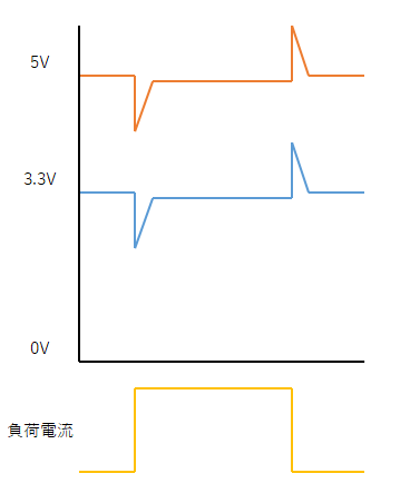 ちなみに3.3V側も同じことが起こるのですが、負荷側は自分で管理できる回路なので対策すれば減らすことができます。減らすための方法がこの「LDOの負荷過渡応答と改善方法」にて解説してあるはずです。