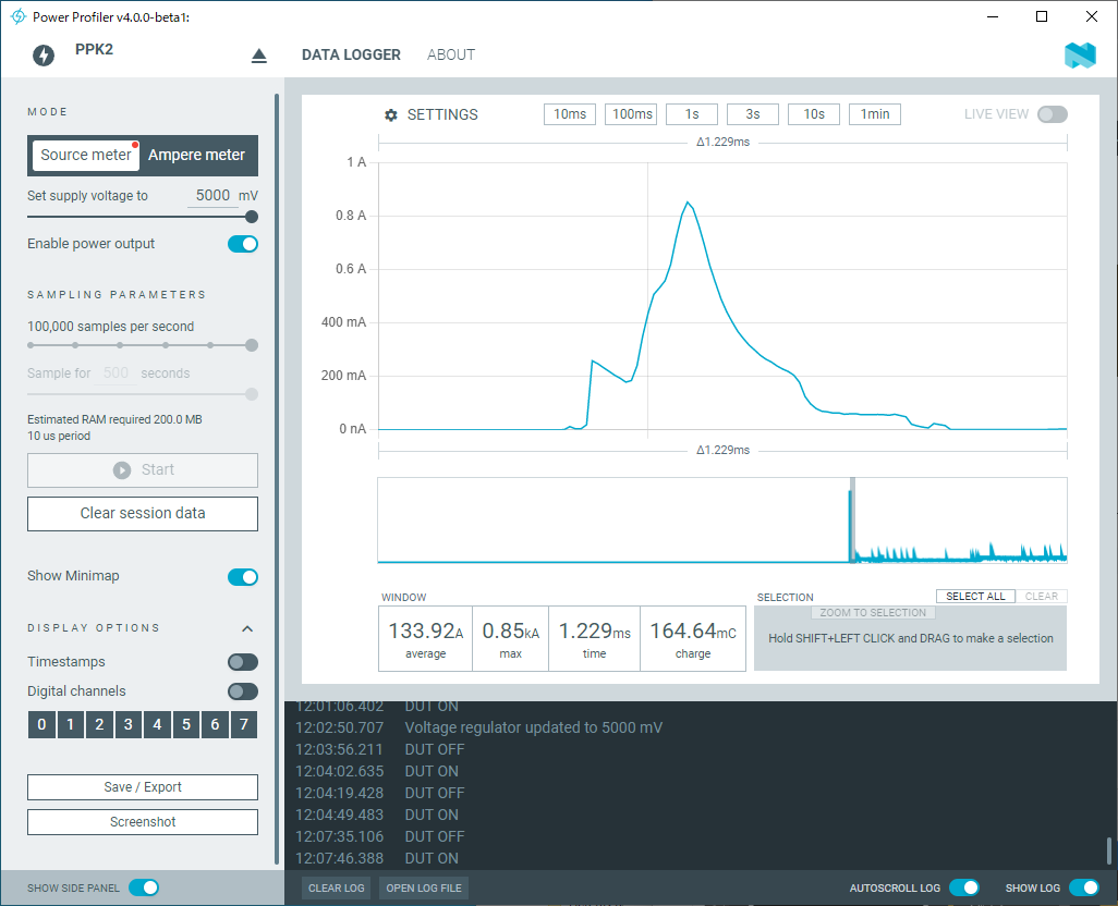こちらだと時間解像度が低すぎて82mAしか測定できていませんし、電圧低下もわからないですね。んー、やっぱりオシロスコープで測定しないとだめな気がします。