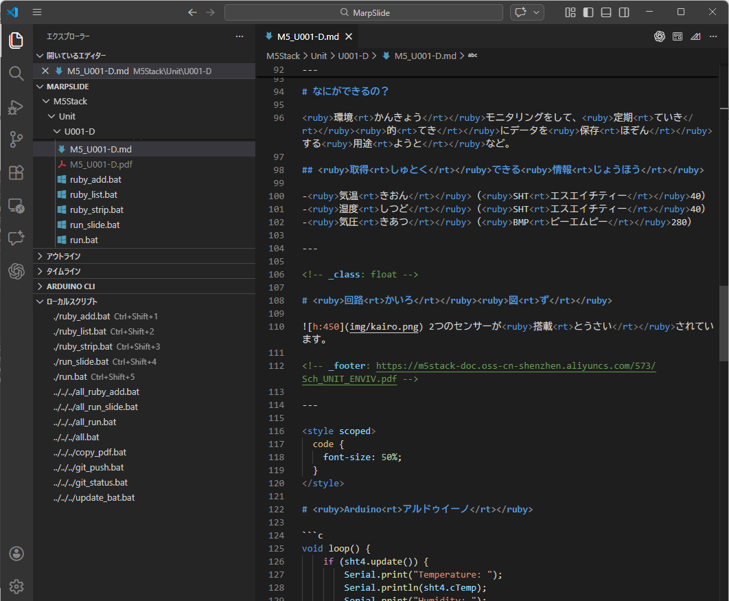 スライドデータをMarp形式のマークダウンで書いているのですが、総ルビにしているので、ツールでルビをつけたり外したりしながら確認をしています。
