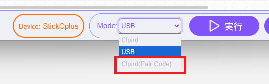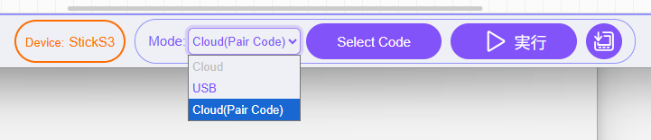 上記のModeをCloud(Pair Code)にする必要がありますが選択できません。まずはデバイスをStickS3に変更する必要があります。