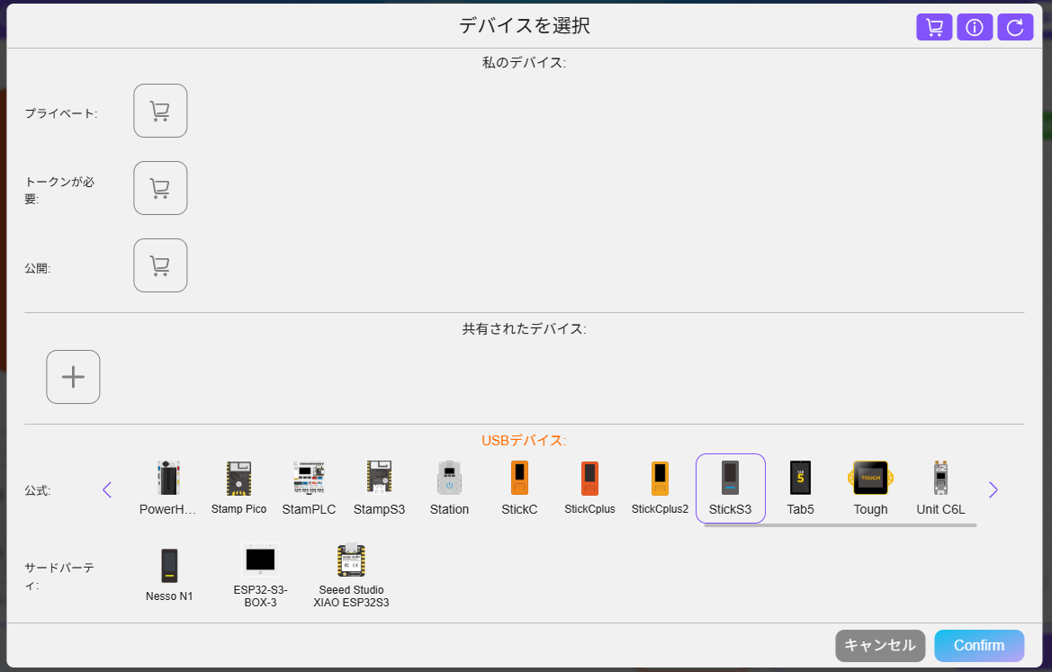 デバイスボタンを押すと上記の選択画面がでるのでStickS3を選択して、Confirmボタンを押します。