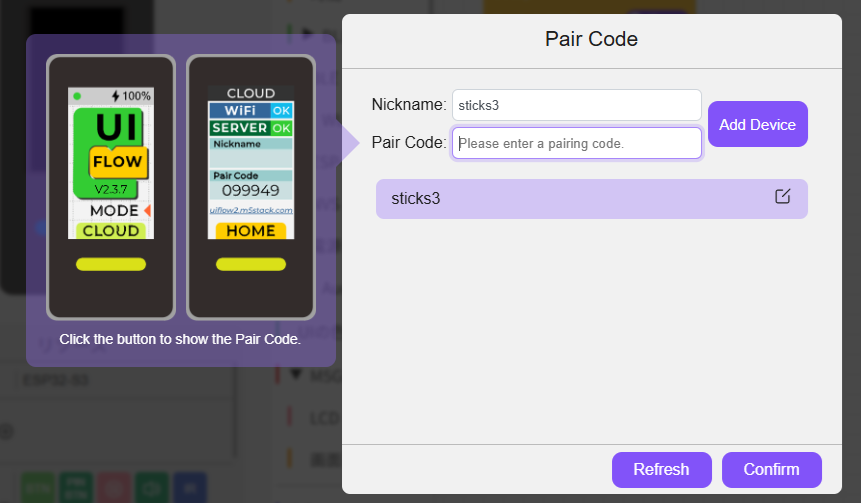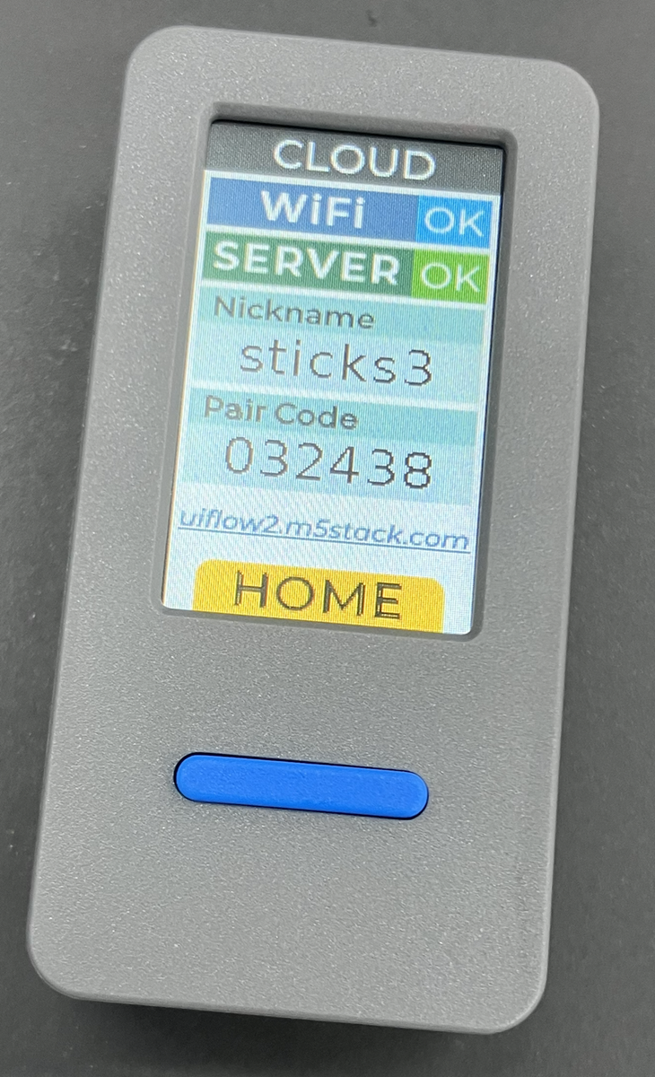 UIFlow2を起動して、青いホームボタンを押すと状態が表示されます。Wi-Fi接続が成功してすこしたつと上記の様のPair Codeが表示されます。これは2時間程度有効な一時キーで、このキーをブラウザ上から設定することでピアリングをする仕様に変更になりました。