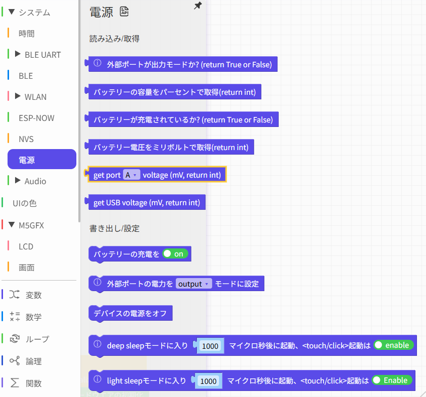次に、StickS3に特有の機能である電源まわりをみてみます。バッテリー電圧とUSB接続されているかがわかるみたいですね。ちょっとまだ機能が少ない気がします。設定をみると外部ポートの電力設定があります。これは頭のところにあるピンソケットの他にユニットなどを利用するときのGrove端子への電源出力もここの設定のはずです。