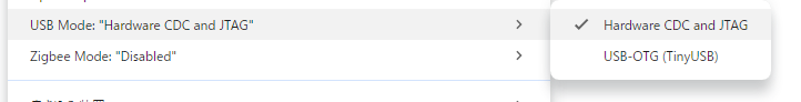 このとき問題になるのが上記のUSBモードです。「Hardware CDC and JTAG」は通常のUSBシリアルポートとして認識されるモードです。このモードのときには書き込みが可能ですが、「USB-OTG(TinyUSB)」モードの場合には書き込みができません。