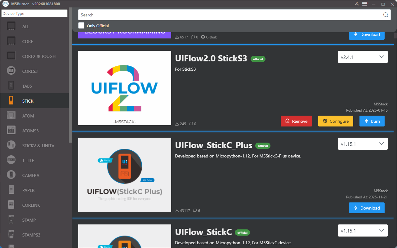 まずは起動して、左メニューからSTICKを選択。その後右側でStickS3用のUIFlow2.0を探してDownloadします。これまでのUIFlow2はログインをしていないと書き込みができなかったのですが、StickS3からは大幅な変更が入っています。ログインが不要になり、接続方法もかなりかわりました。