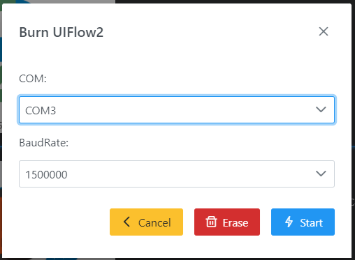 Burnボタンを押すとシリアルポートが聞かれます。このときにはダウンロードモードにするために電源ボタンを長押ししてから接続してください。起動中に長押しをしても大丈夫です。私の環境ですとUIFlowが動いているときにはCOM3でしたが、ダウンロードモードに変更するとCOM4になりました。
