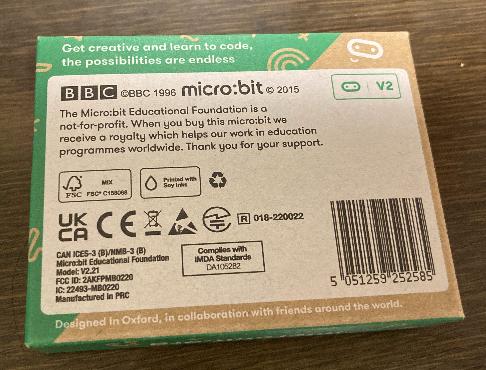 裏面の右下にバージョンが書いてあります。現時点の最新であるV2.21になります。micro:bitはイギリスのBBCが教育用に作ったボードになります。Arduinoはイタリアなのでヨーロッパはこの手のに強いですね。