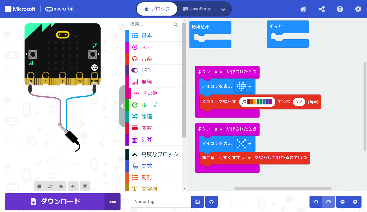 プログラムをするときにはブラウザからかんたんにできました。ブロックを組み合わせて、ダウンロードをするとプログラムファイルが保存され、それをmicro:bitを接続すると見えるドライブにコピーすることで動かすことができます。