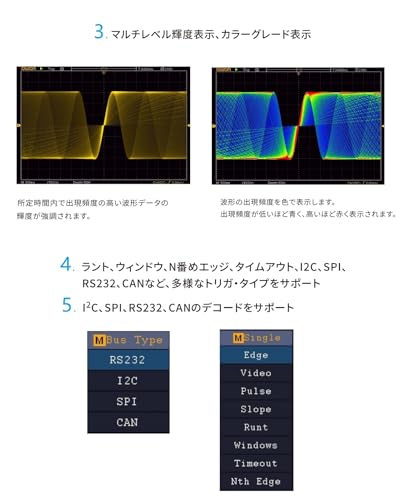 実際のところ、I2CとUARTを測定するのであれば、できれば1MHz以上の機種。標準速の4MHzのSPIを測定するんであれば10MHz以上の機種になると思います。高速のSPIを測定するのには100MHz、USB2.0を測定するのには1GHz以上の機種になります。