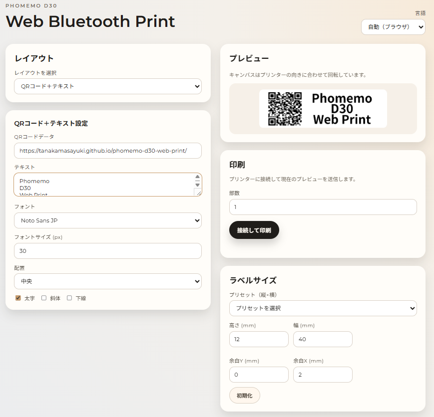 Phomemo D30は非常に便利なプリンターなのですが、アプリがスマホ向けしかありません。通常パソコンを利用して作業をしているので、パソコンから利用できるアプリがないか調べたところ、ブラウザからWeb Bluetoothを利用して印刷するサンプルがあったので、自分でも作成してみました。