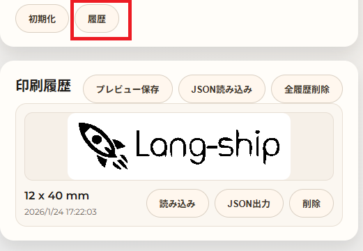 履歴ボタンから印刷履歴の表示機能も作りました。実際の印刷をするか、プレビュー保存ボタンを押すと履歴に追加されます。読み込みボタンでその時の設定を読み込んで編集してから印刷ができます。JSONの入出力も作っているので雛形を作って複数のマシンで共有することも可能です。