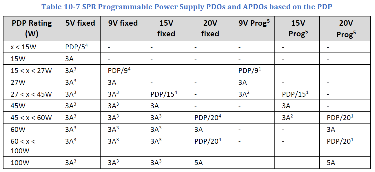 上記の表があります。20V以下の場合のみまとめた表で、100Wのアダプタの場合には一番下で5V/3A、9V/3A、15V/3A、20V/5Aをサポートする必要があります。fixedが固定電圧で通常はここのみなのですが、PPSと呼ばれる可変電圧のオプション規格もあり、それをサポートする場合にはProgの欄になります。PPSは別項目で説明予定です。