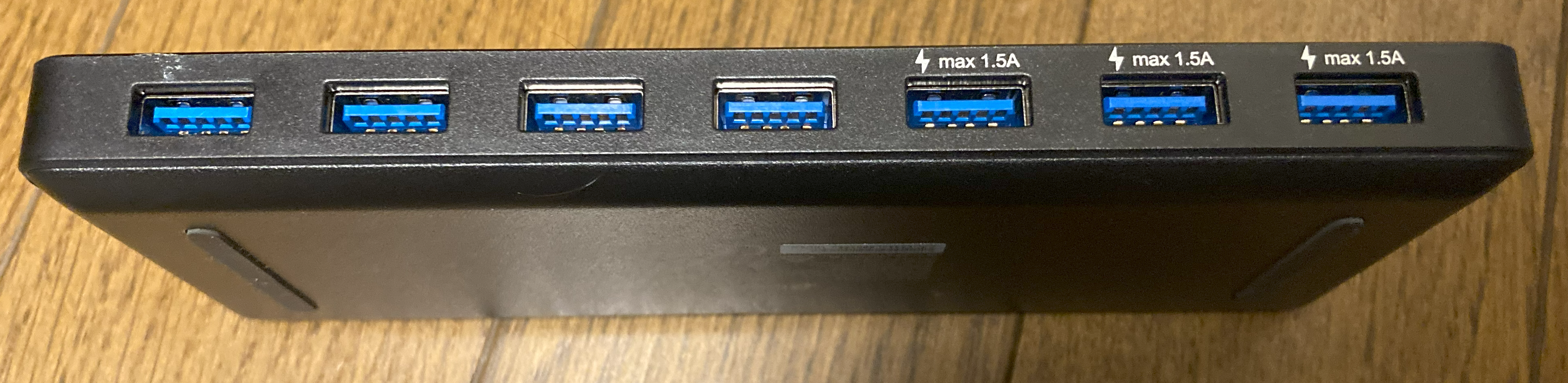 7ポートありますが、右側3ポートは1.5Aまでで、残りの4ポートはUSB3.0で0.9A、USB2.0で0.5Aまでみたいです。