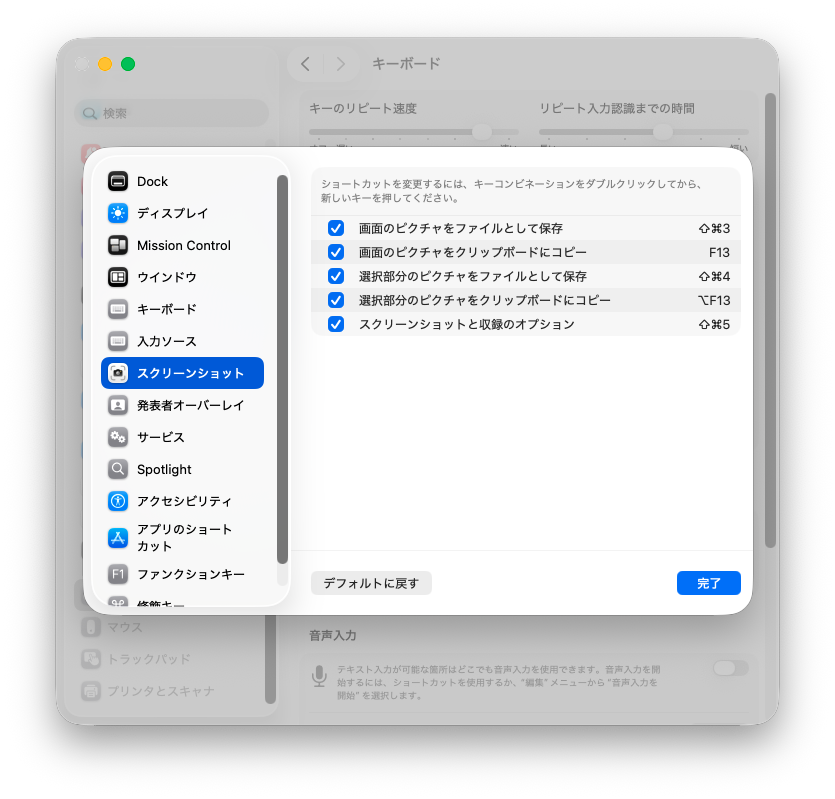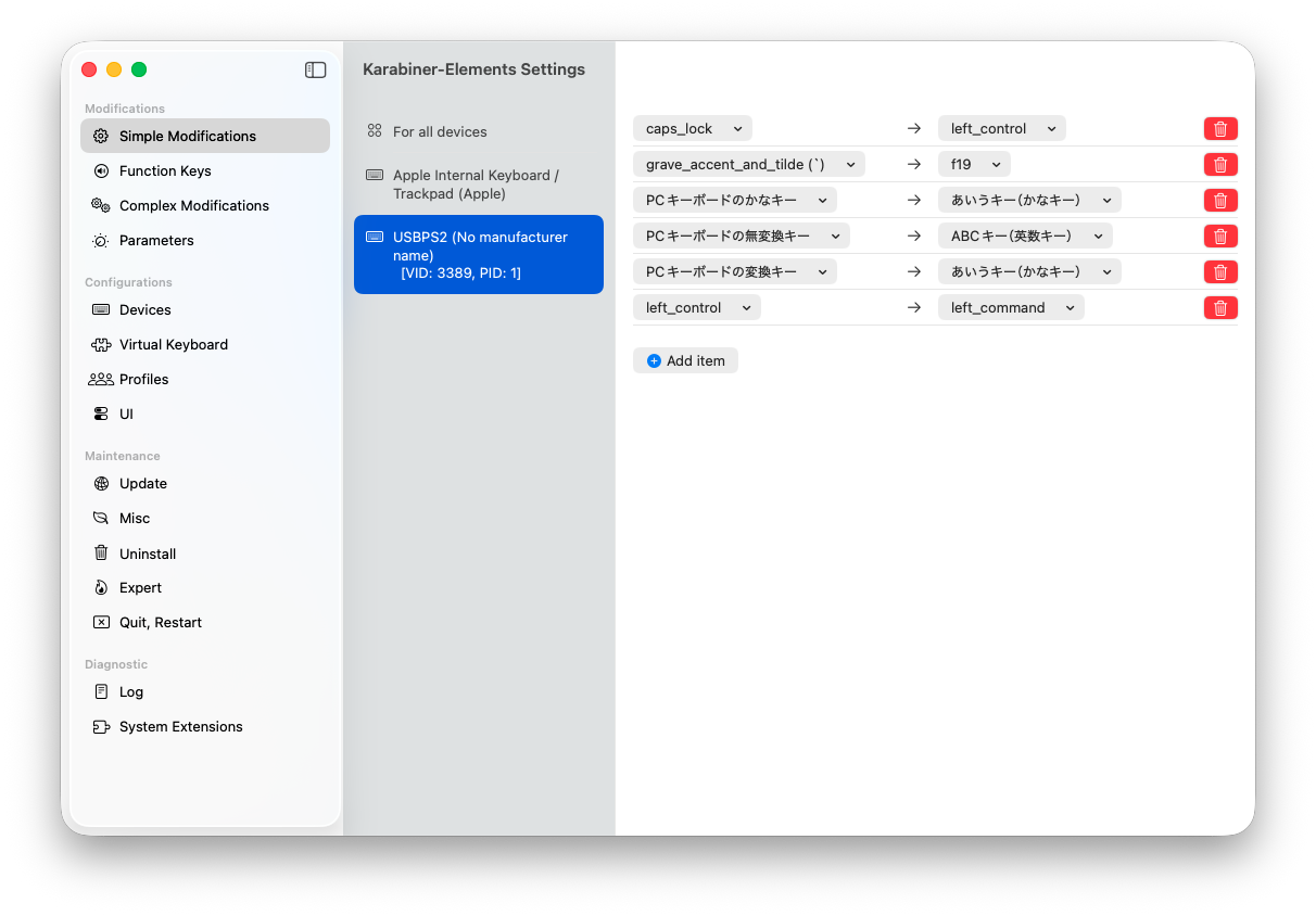 基本はWindowsばかり使っているのでMacの設定もWindows風にしましたが、キーボード単位で設定可能なのが便利ですね。Macbook本体のキーボードは変更していません。ただスクリーンショットのF13がどこにあるのかわからないので利用できなくなっています。