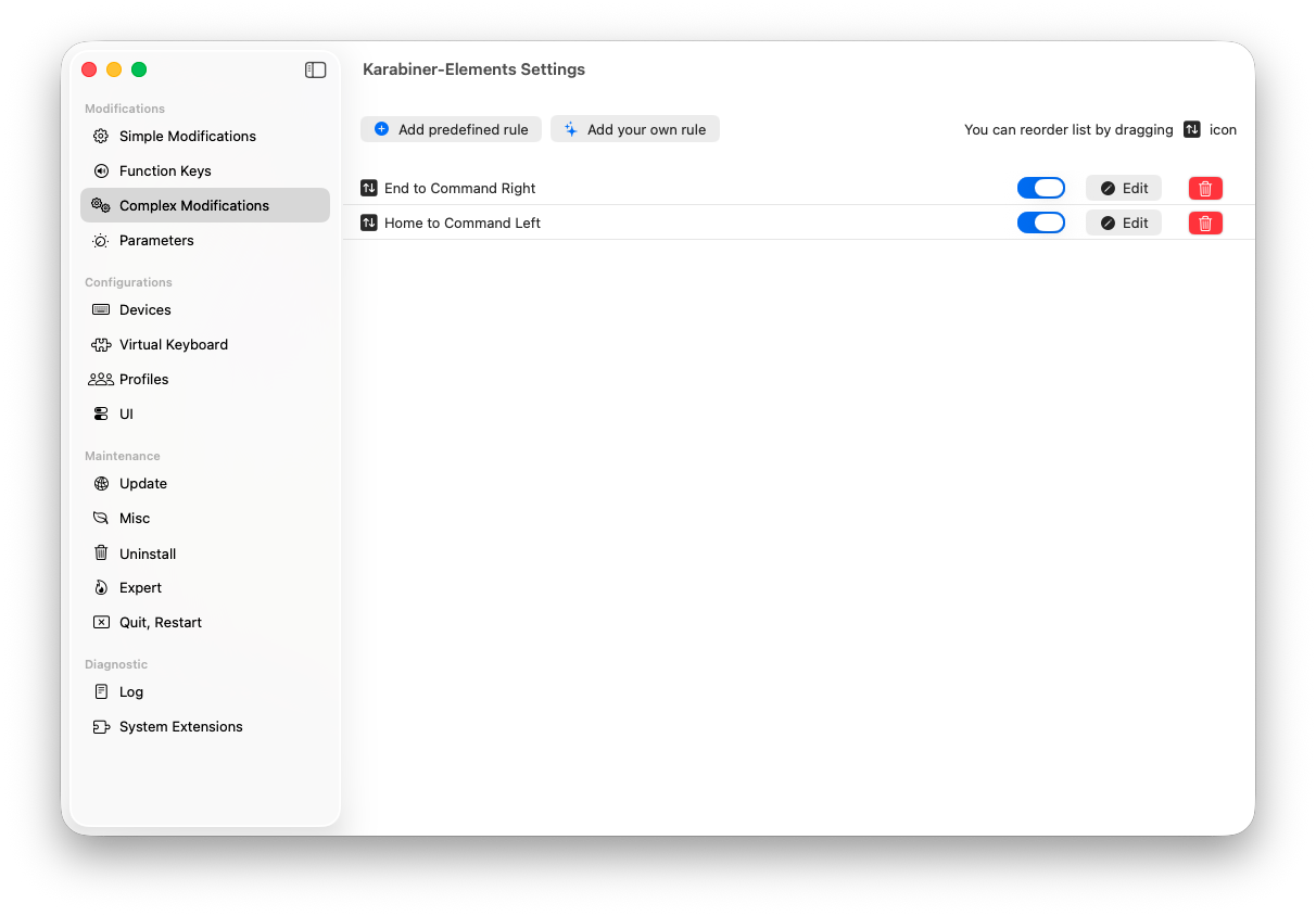 最終的にはKarabiner-Elementsを入れました。こちらはキー入力を横取りして置き換えてくれるソフトになります。