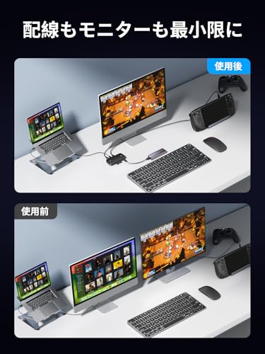 ✅【「PC/ゲーム機2台+HDMIディスプレイ1台」のユーザー向け!】Lemorele USB-C to HDMI KVM スイッチは、2台のUSB-C出力デバイス(デスクトップPC/ノートPC/ゲーム機)間でシームレスに切替可能。1組の周辺機器(有線・無線キーボード、マウス、USBメモリ)、マイク内蔵ヘッドセット、HDMIディスプレイ1台を共有できます。※給電前にはすべての接続ケーブルが対応デバイスに正しく接続されているかを厳密に確認してください。Nintendo Switch 1接続時、Lemorele USB-C to HDMI KVMスイッチに給電ください。(Switch 2は非対応)