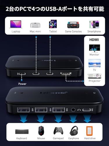 2入力1出力 USB3.0 HDMI KVM切替器:このHDMI KVM切り替え機は、2台のパソコンを1台のHDMIディスプレイと1本のUSB-C機器&1組のマウス・キーボード、プリンターなどのUSB機器を共有できます。それぞれのPCにディスプレイを用意する必要がなく、省スペース・広々とした操作感を両立できます。